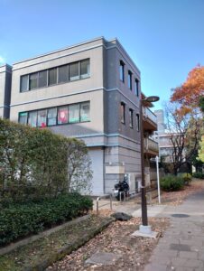 出口を出てバスターミナルを右方向へ。ターミナル前の通りをせせらぎ公園に向かい突き当たりの3階建てのビルです。